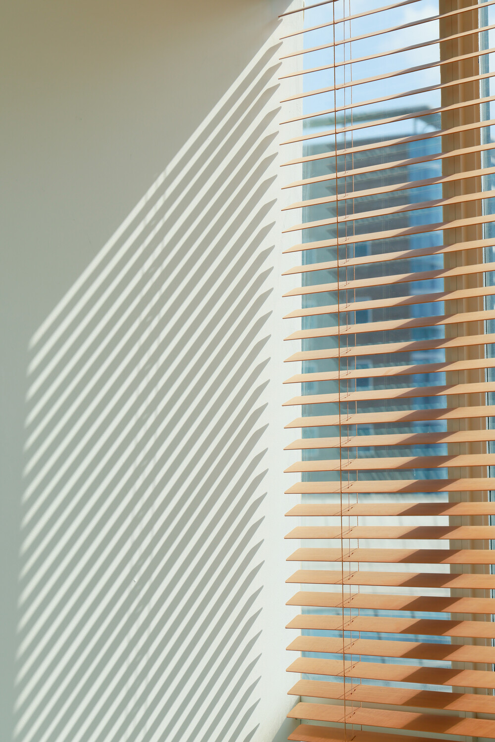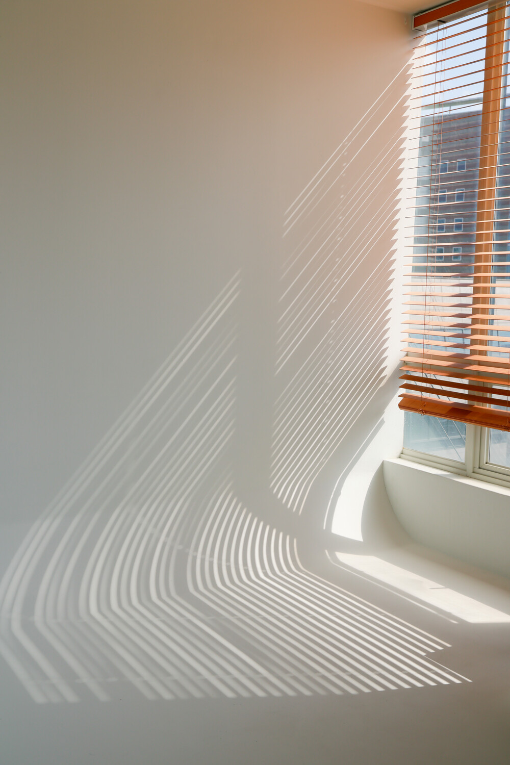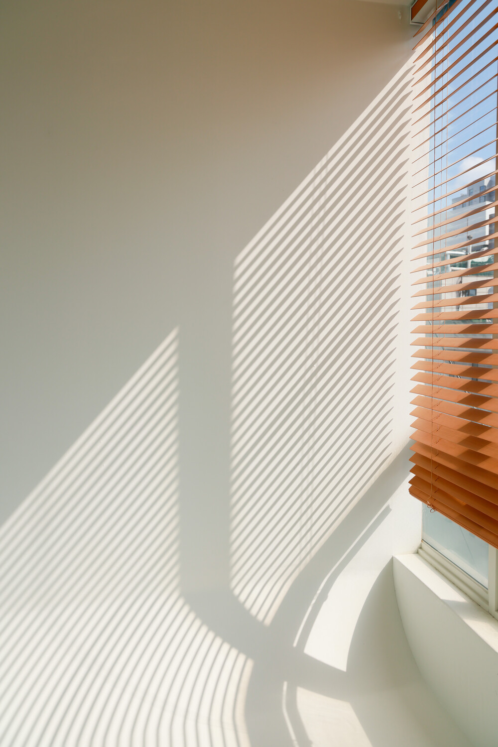 남향 통창과 블라인드가 만들어내는 선명한 그림자 텍스처.