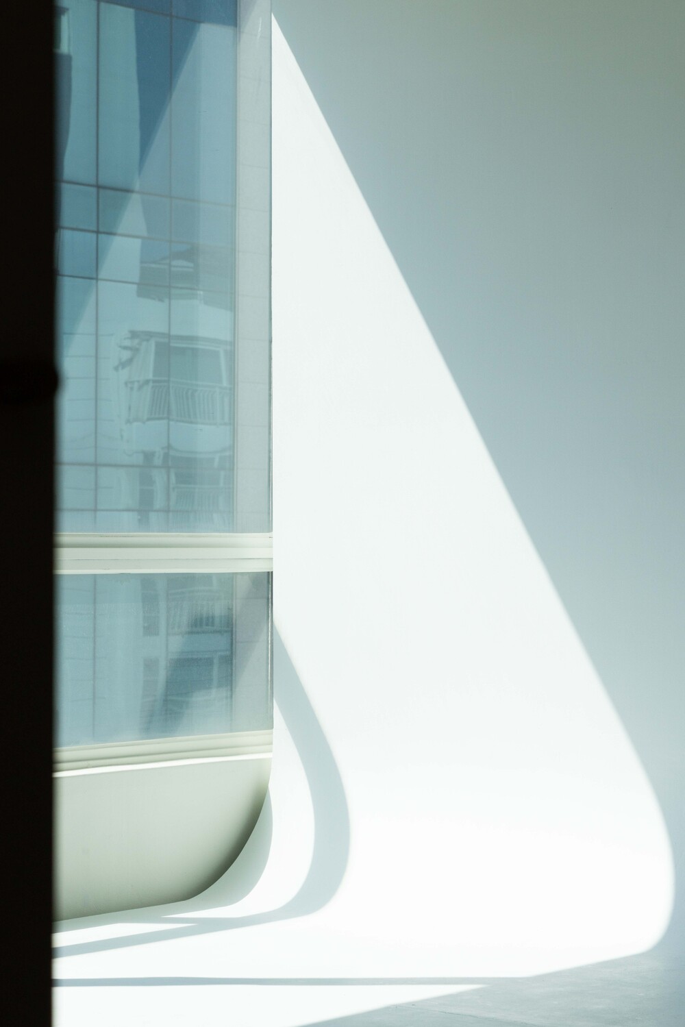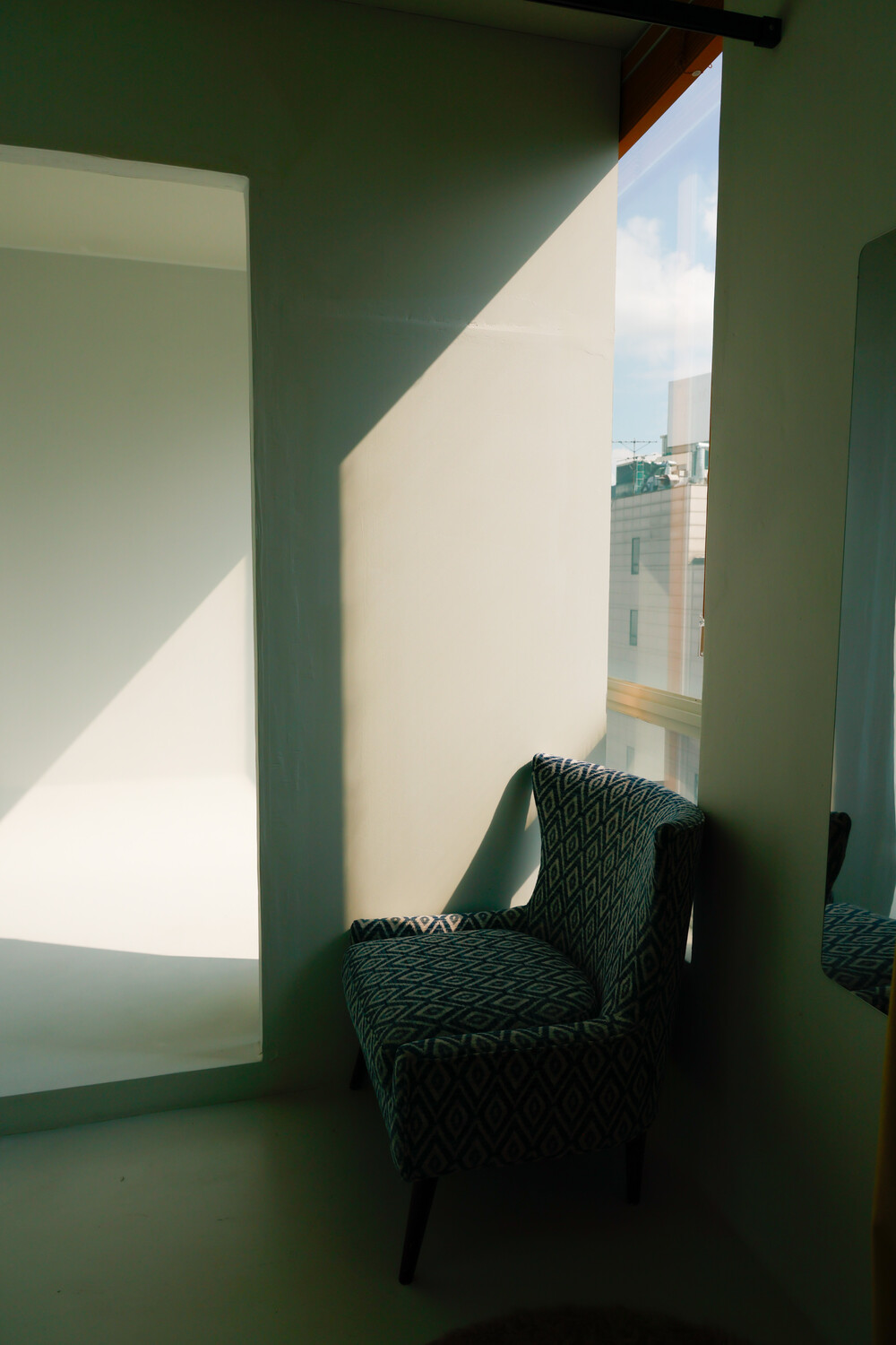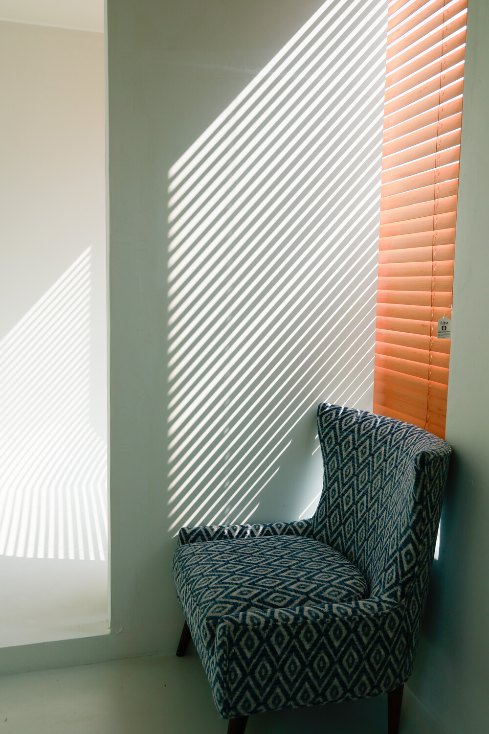 남향 통창과 블라인드가 만들어내는 선명한 그림자 텍스처.