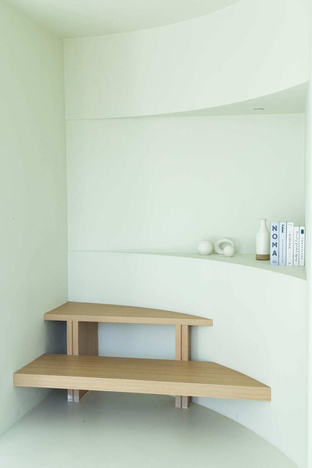 곡선형 벽면과 맞닿은 두 단의 나무 선반 구조. 미니멀한 스타일 연출 및 정적이면서도 안정적인 구도에 적합.